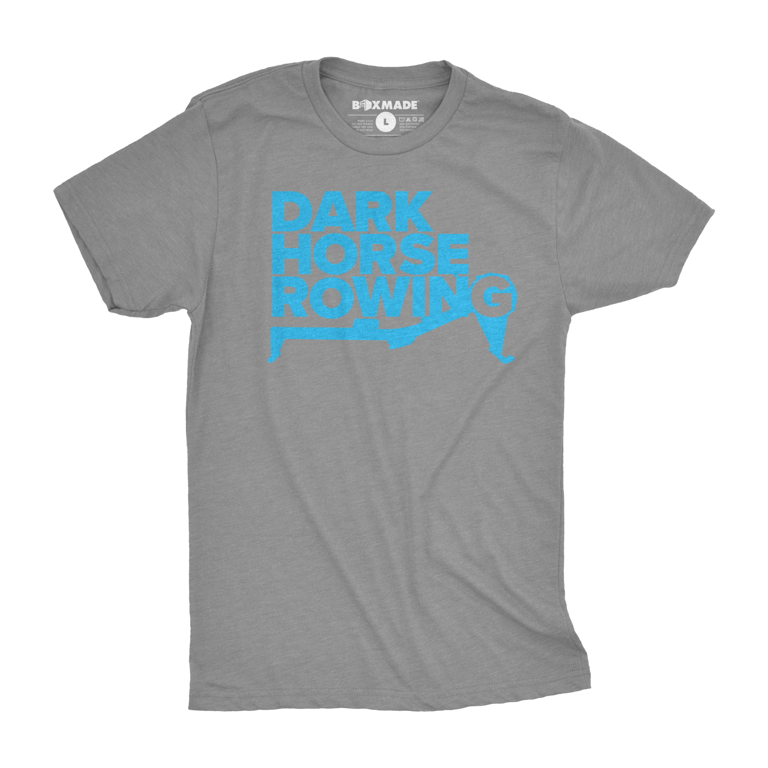 After several attempts at incorporating a Concept 2 rowing erg into a graphic design we settled on this combination of the machines silhouette with the Dark Horse Rowing in a bold sans serif heading. The result looks great printed on a t-shirt.